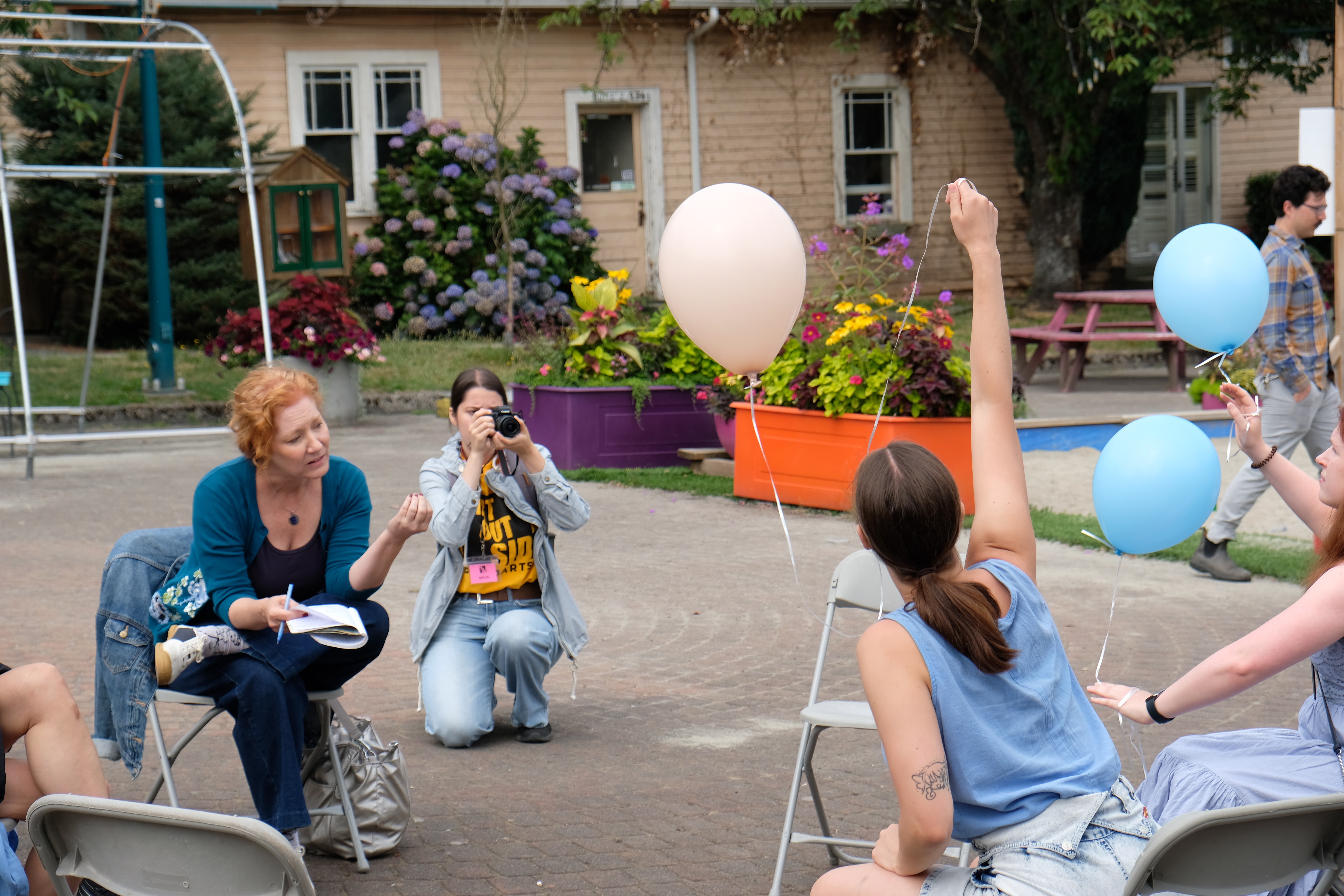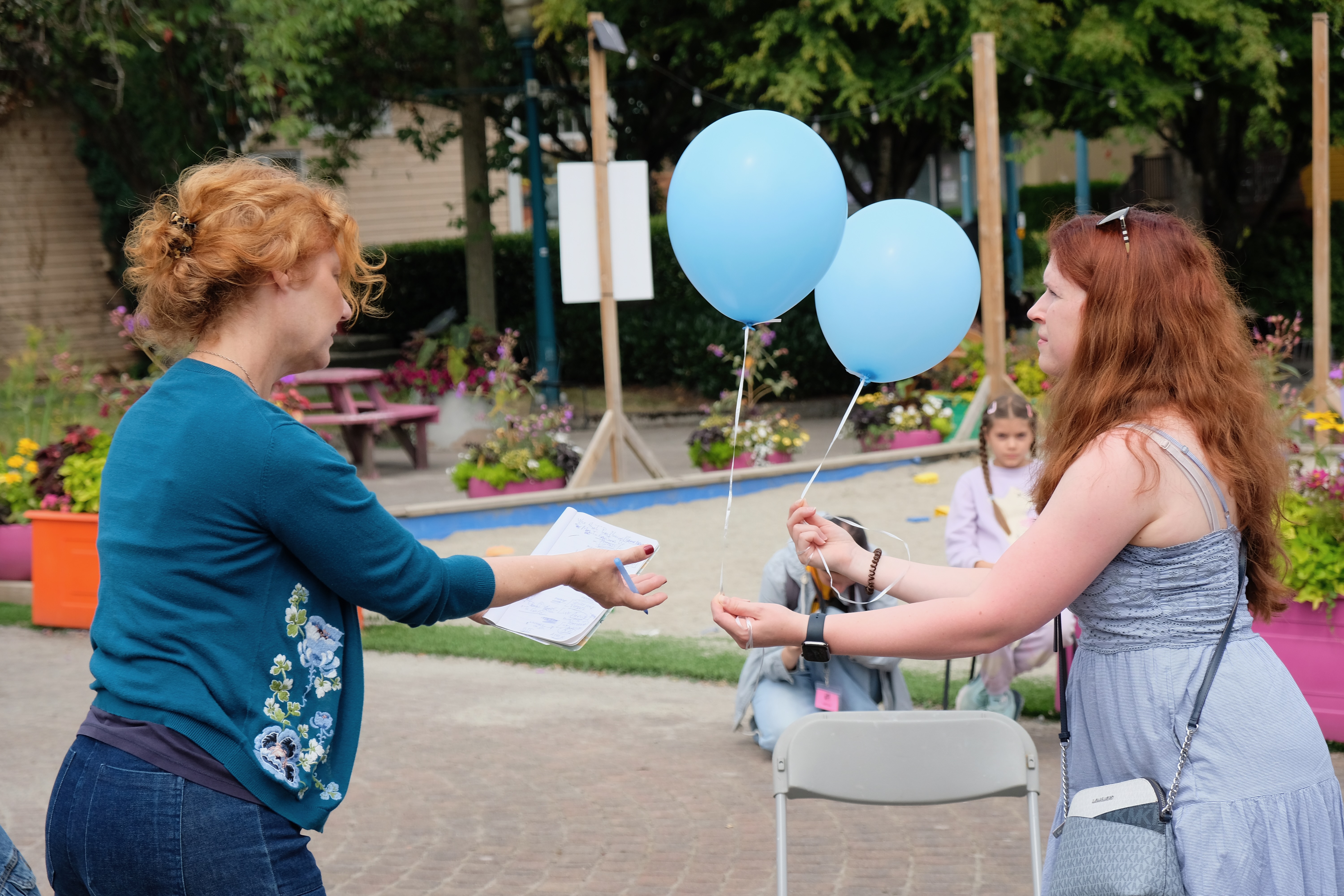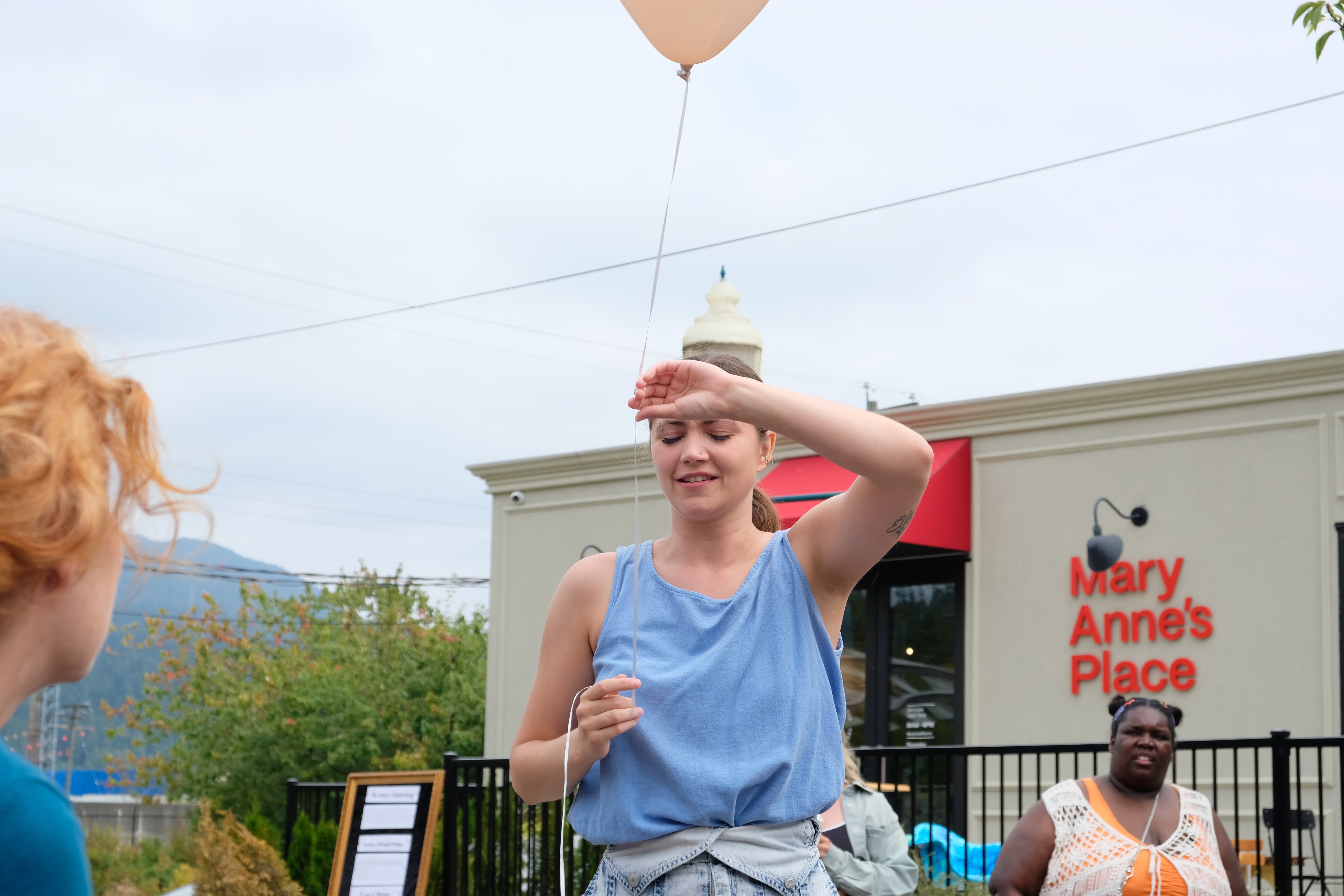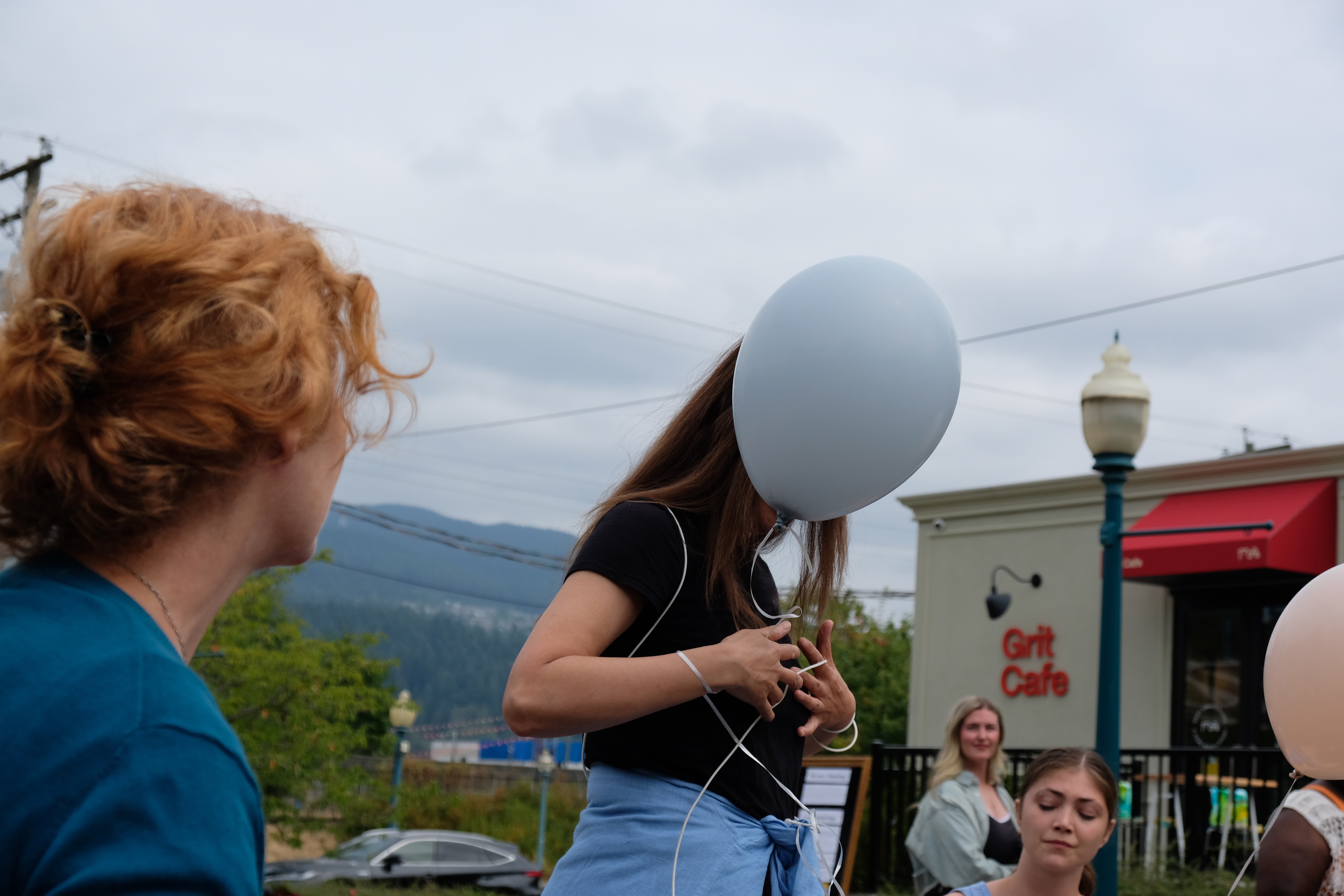 Audience members were invited to participate in a community art installation by writing down what they want to let go of and tieing it to a balloon — a collective act of letting go.